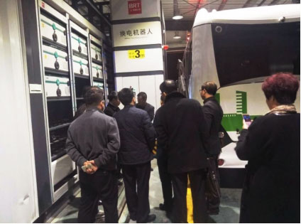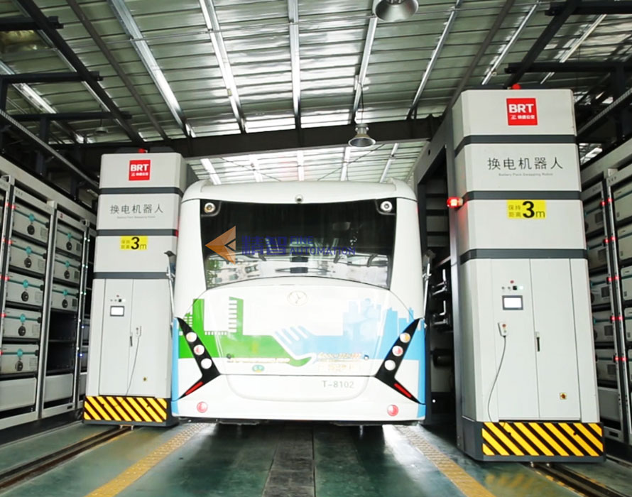 車子進站停靠入位,換電機器人自動識別并更換公交車內能源電池。機器人通過識別,將車內的電池取下并放到兩側的充電架上,能源電池自動進入充電模式;機器人將根據系統提示,將充電架上充滿的能源電池取出并更換至大巴車上,整個換電過程大約9分鐘。