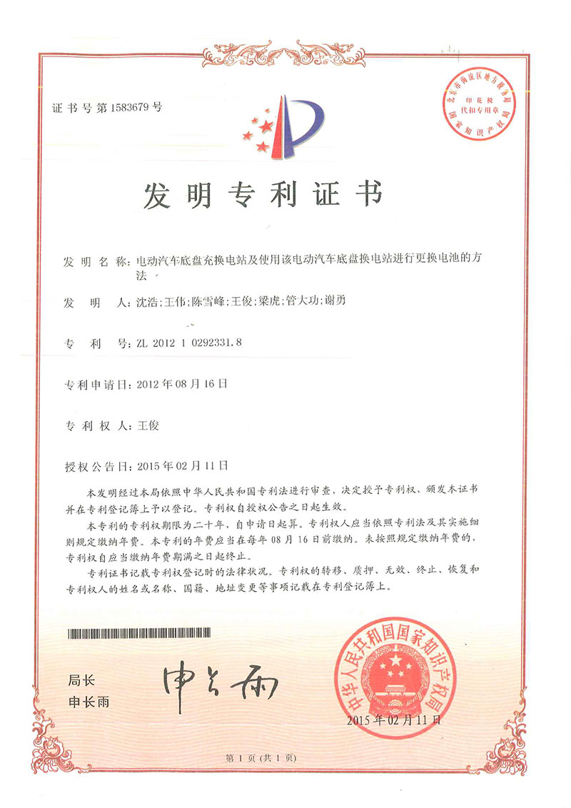 • 電動汽車換電-專利證書
