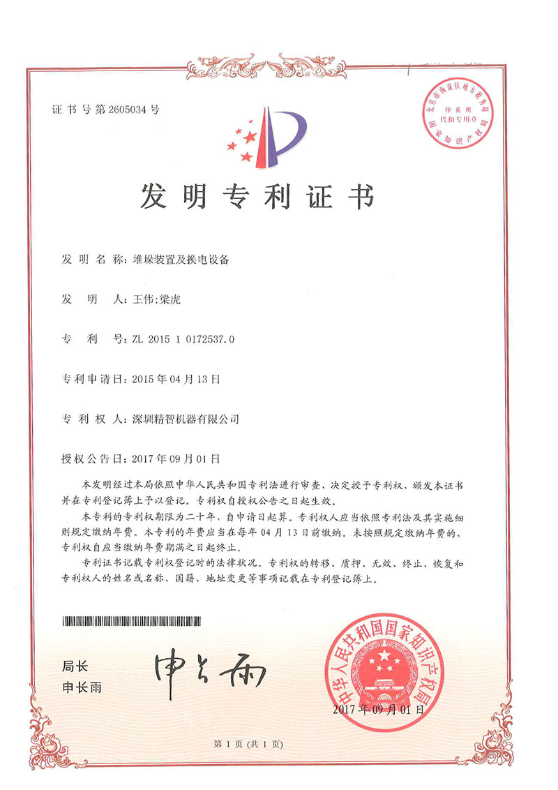 • 堆垛裝置及換電設備-專利證書