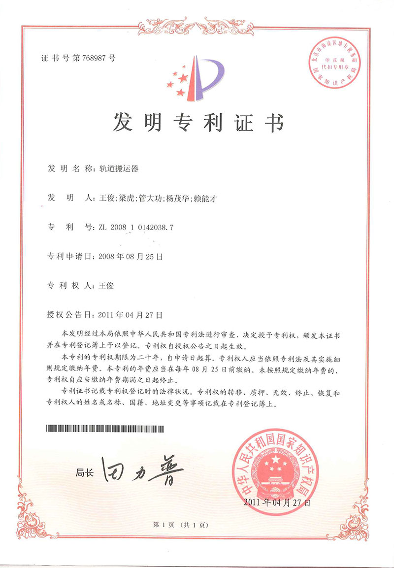 • 軌道搬運器-發明證書