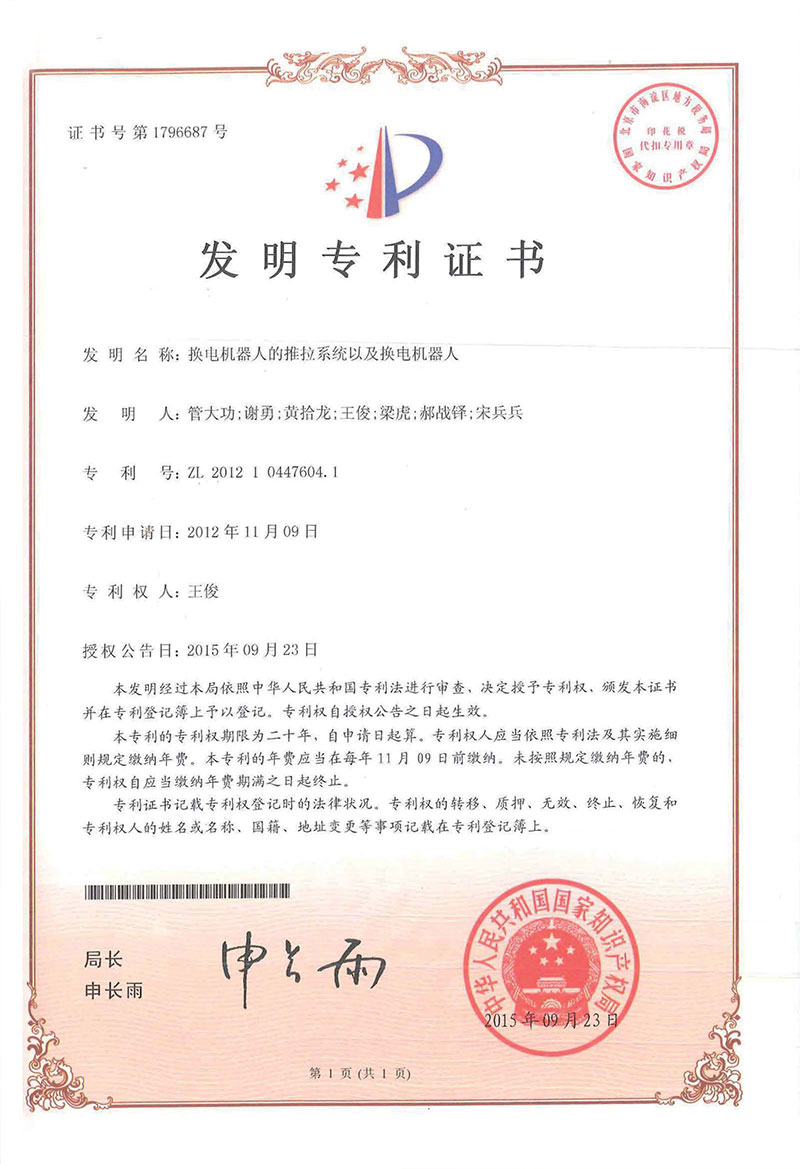 • 換電機器人的維拉系統-專利證書