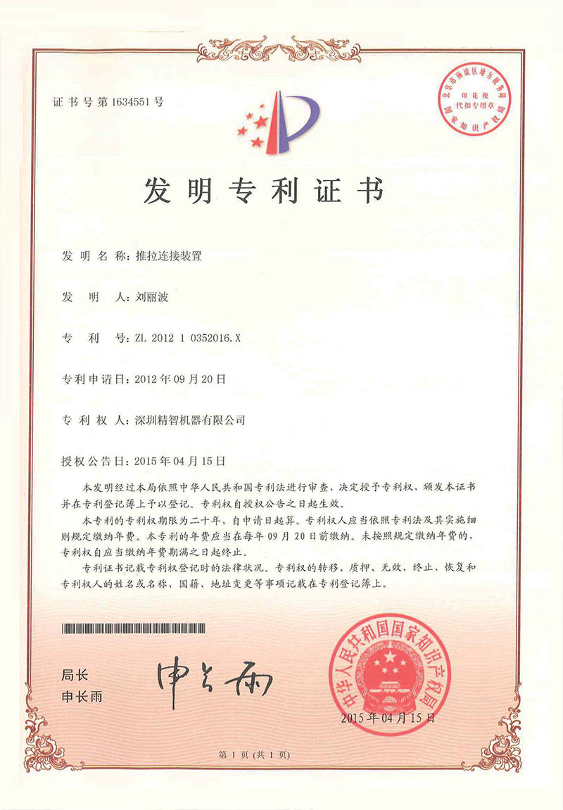 • 推拉連接裝置-專利證書