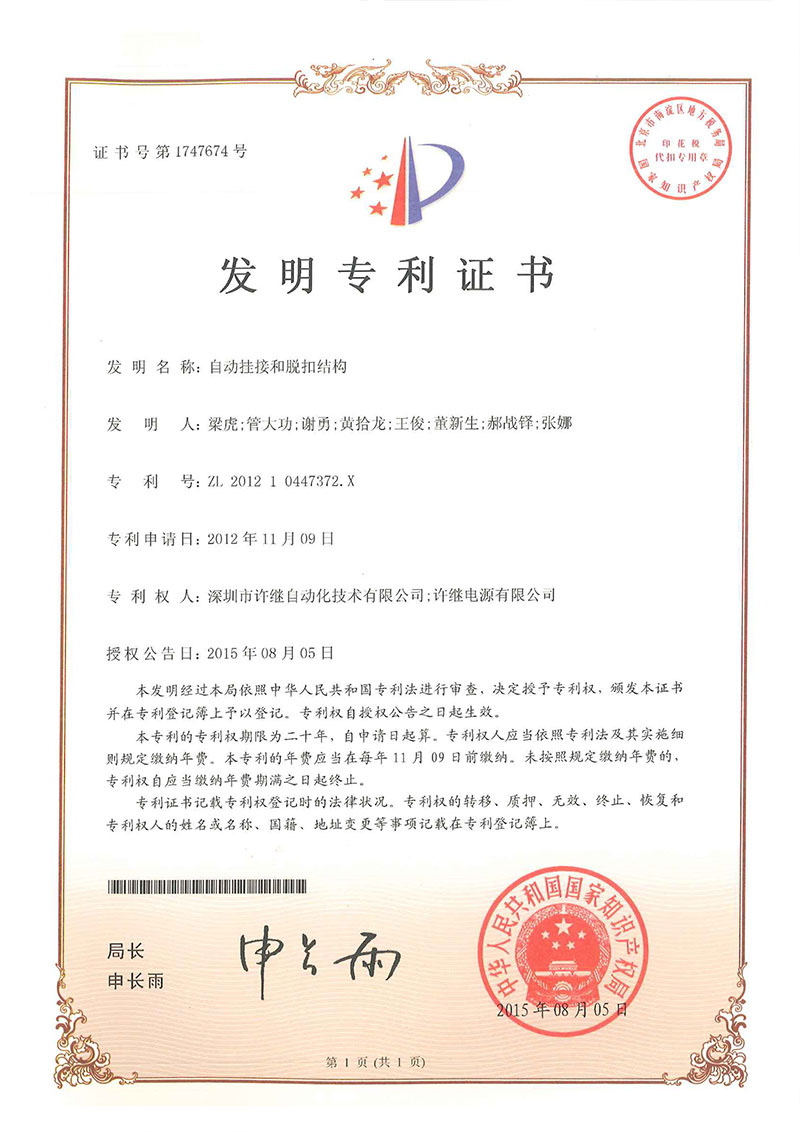 • 自動掛接和脫扣結構-專利證書