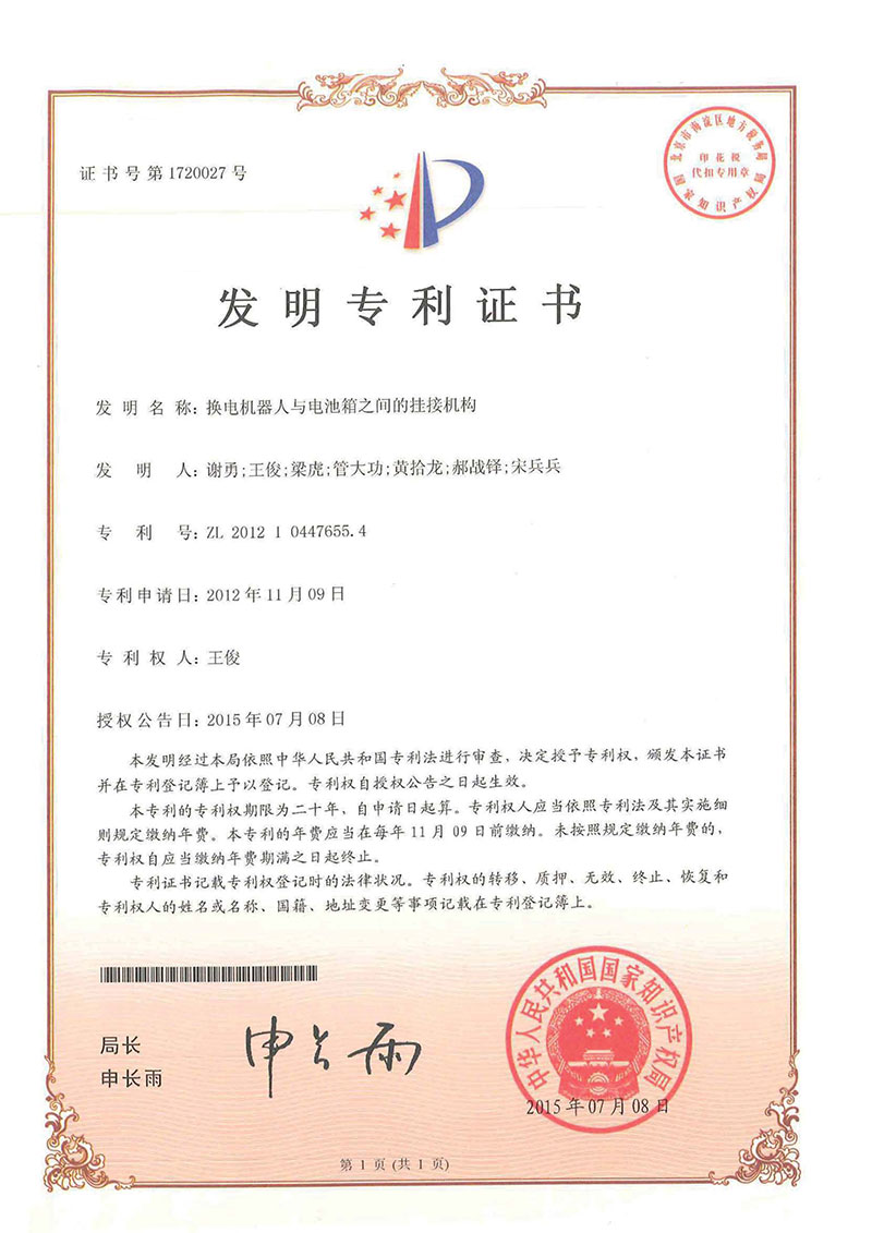 • 更換電池機器人-專利證書